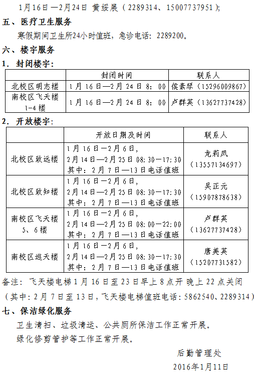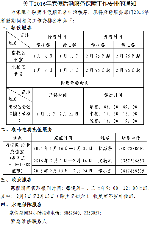 关于2016年寒假后勤服务保障工作安排的通知