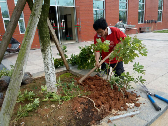 植树造林山川秀,栽花种草庭院香。为了使春天的校园更美丽,物业科员工们默默地辛勤劳动,到处都看得到他们忙碌的身影:在南校区食堂门口银杏树下,为花坛种上了绿植;为花坛更换了部分鲜花;清理了部分死角处的枯枝……;为了不妨碍教室上课和同学们平时的休息,他们还利用每个周六的时间进行草坪的修剪。在校园内随处可见学校内的老师、同学们拍照的身影,校园内充满着鸟语花香。
