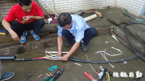 为了保证周二晚上网球场的正常使用,6月17日早上8:30分起,后勤水电管理科4名电工携带工具早早到达现场,开始了电缆铺设工作。由于电缆重,转角多,布线难度大,我们的电工完全顾不上浑身汗流浃背,清理被损坏电缆、铺设新的电缆线、剥线头、清理电缆芯,准备对接电缆、处理对接线头、焊接、缠绝缘带、热熔固定,再缠防水带、绝缘带、保护胶套、热熔固定……。经过全体人员密切配合,至下午15点,顺利完成近百米的电缆铺设任务,及时为网球场的正常使用提供电力保障。