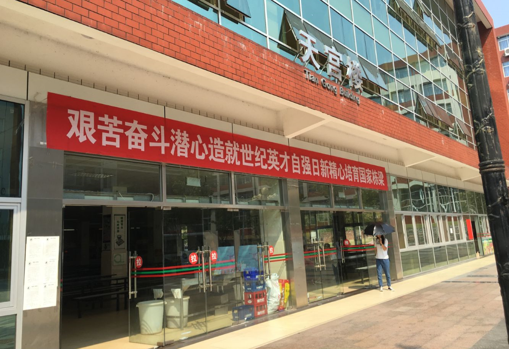 图为南校区食堂为迎新挂出的激励横幅 新生到校期间,在校学生已达到约13500人。在迎新期间,南校区食堂每天早餐用餐人数约2700人,中餐用餐人数约 3800人,晚餐用餐人数约3100人;北校区食堂每天早餐用餐人数约2800人,中餐用餐人数约3300人,晚餐用餐人数约2600人,单餐就餐率近达到50%。