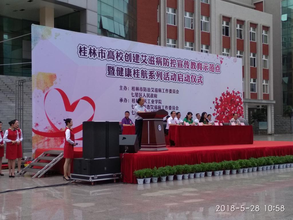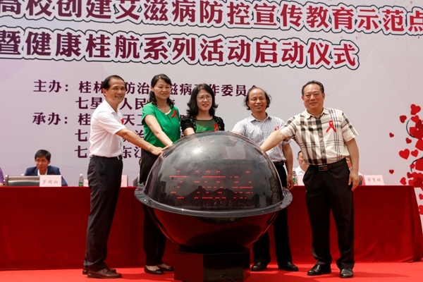 5月28日上午,桂林高校艾滋病防控宣传教育示范点暨健康桂航系列活动正式启动。我校校长易忠,桂林市副市长兰燕、市内各高校艾滋病防控工作分管校领导、市卫计委主任王芳、市七星区副书记肖育明、市卫计委党组成员张朝阳、市疾控中心主任潘定权,以及1000余名我校师生共同参与了启动仪式。
