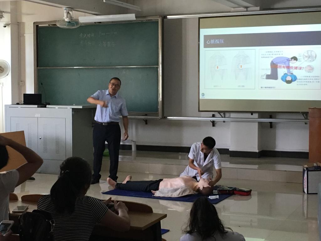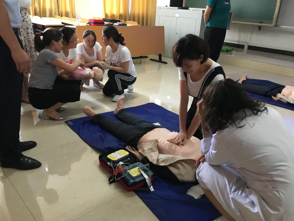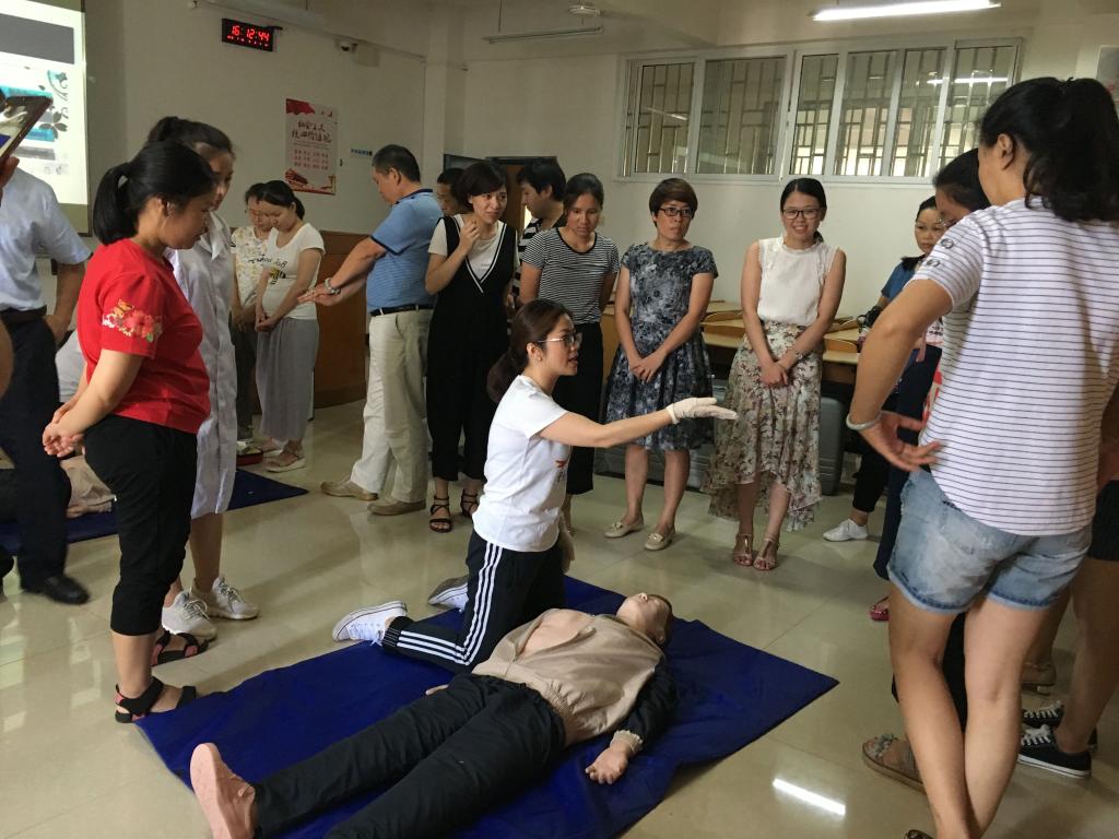 本次培训采取实操模拟和台上台下互动的方式,专家向老师们现场讲授了心肺复苏术等急救技能的基本方法,并用一些实例说明了现场自救互助的必要性和重要性。灵活的授课形式深受大家喜爱,老师们纷纷表示,这次培训学习非常有意义,急救培训学到的技能,在紧急时刻能派上用场、能发挥作用。