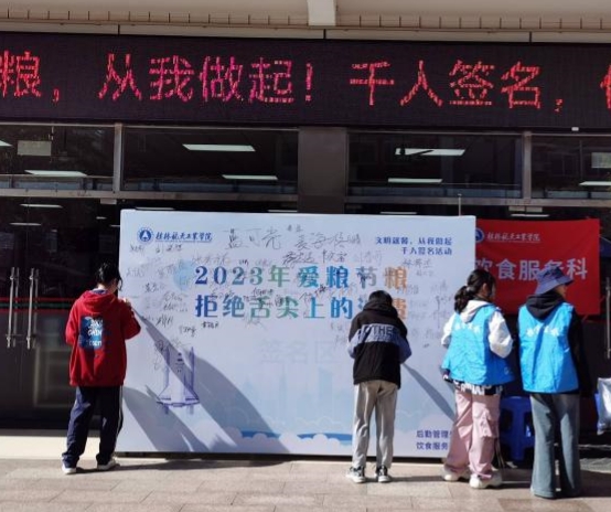 活动中,学生通过参与千人签名活动表达对此倡议的支持,传递对节约粮食的意识。此外,饮食服务科还组织了相关线上宣传活动、问卷调查等多种形式引导大家关注、理解并参与到“爱粮节粮”的行动中来。牢固树立节约光荣、浪费可耻的观念,利用宣传影响、带动其他同学。