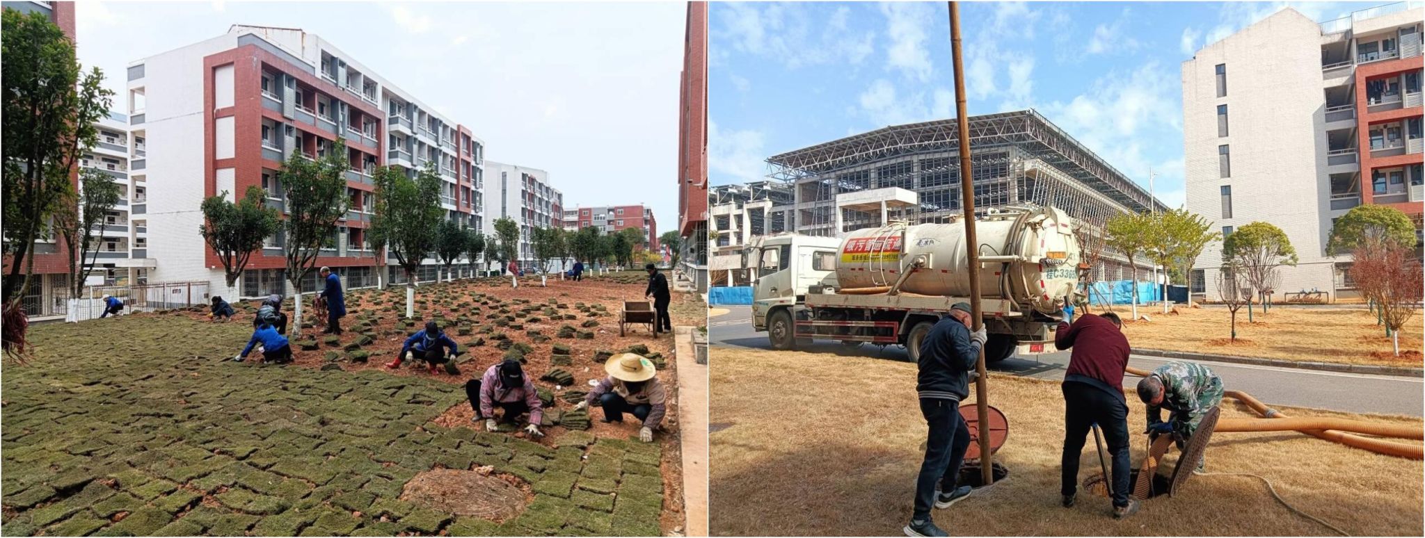 针对校园部分裸露空地,物业科组织人员有序铺种马尼拉草皮,有效提升校园绿地覆盖率;结合各类植物生长习性,制定差异化养护方案,定期开展草坪修剪、杂草清除、科学施肥等工作,同时对校园树木进行整形修剪和病虫害防治,既消除安全隐患,又确保绿植长势良好、树形美观,为冬日校园增添勃勃生机。