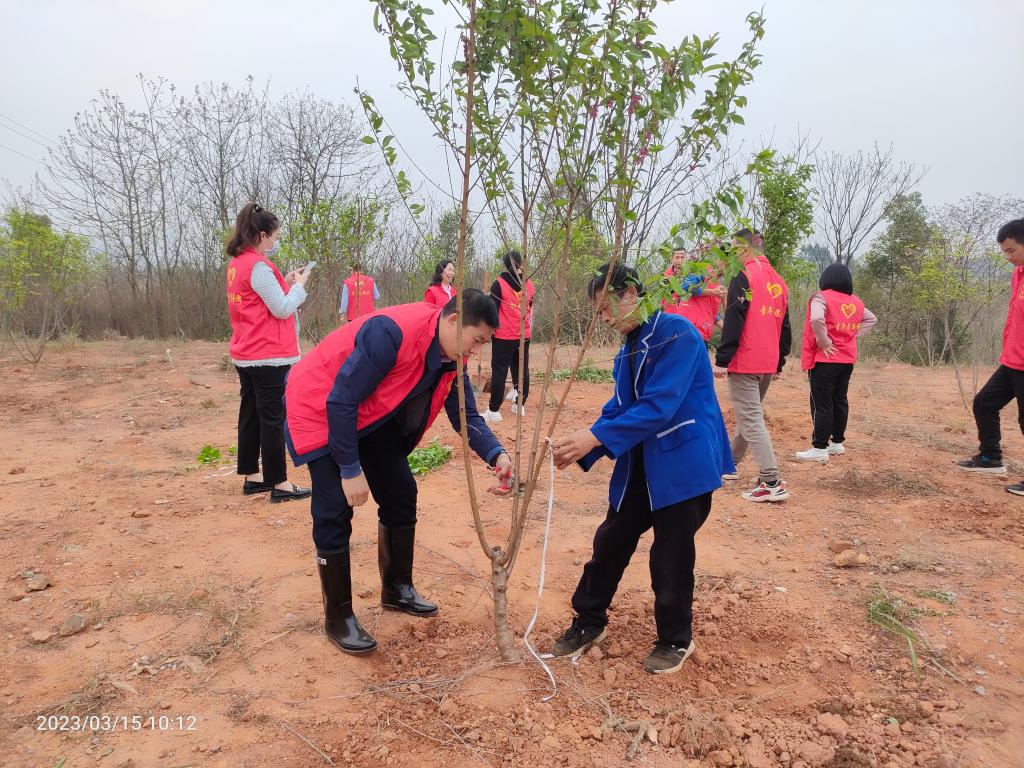 植树现场,党员同志们迎着微风铆足干劲,挥锹铲土、扶苗填坑、修剪梳枝,一片繁忙景象。大家热情洋溢,干劲十足,在愉快的氛围中分工合作,配合默契,共同体验植树的快乐。一棵棵新栽的树苗迎风挺立,焕发着勃勃生机。